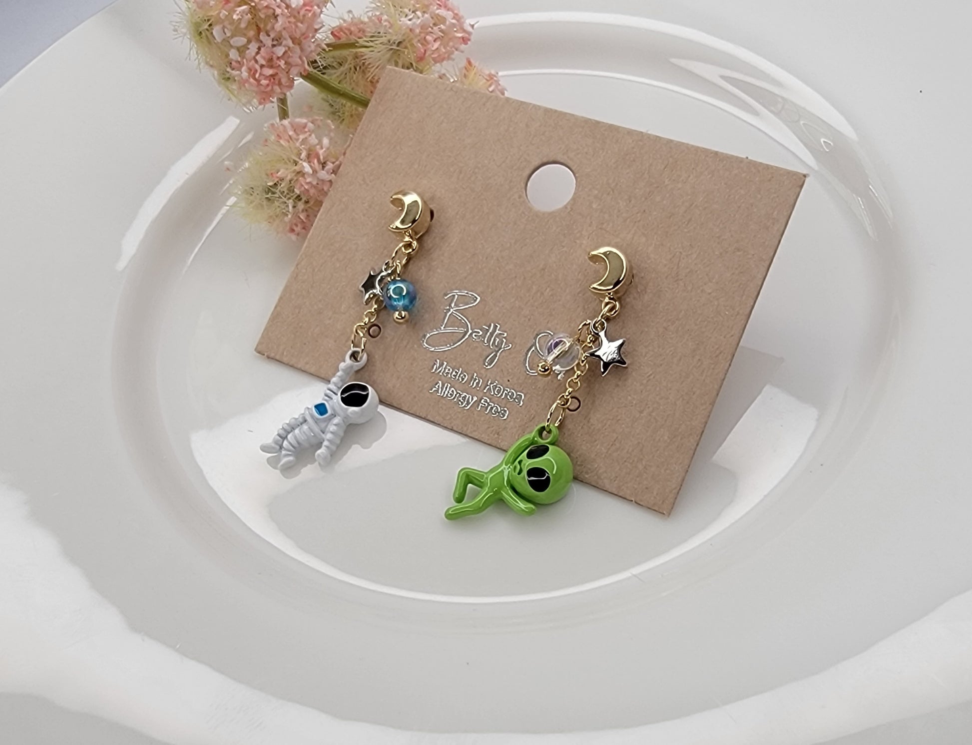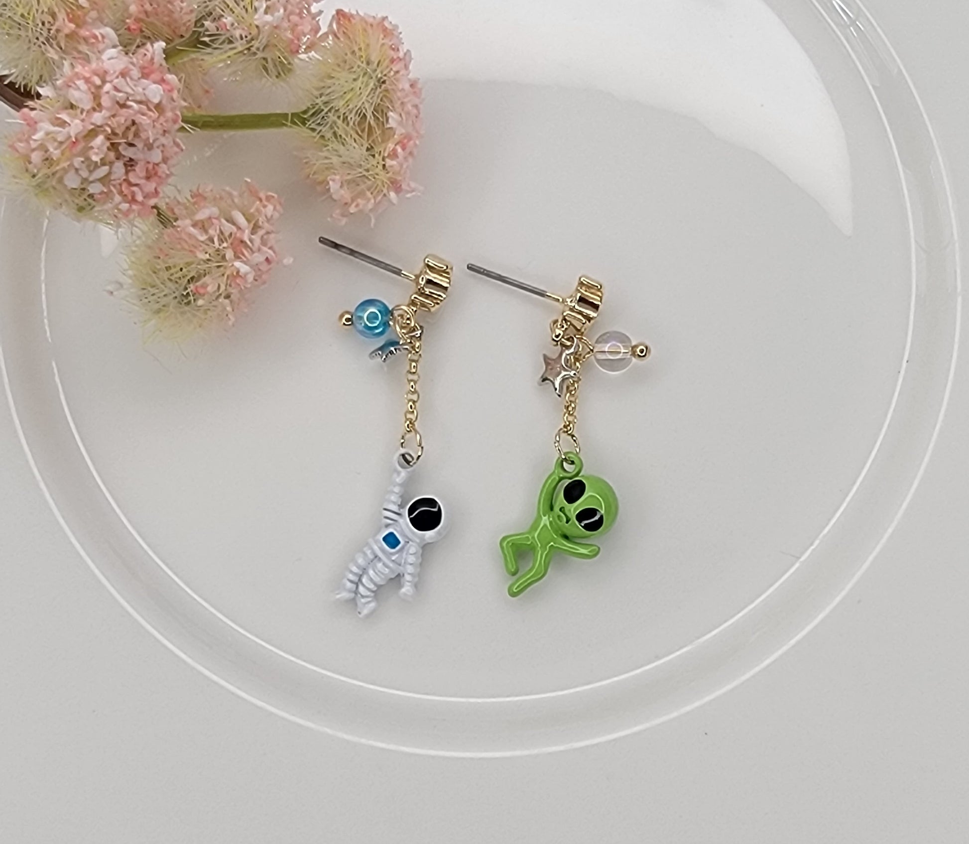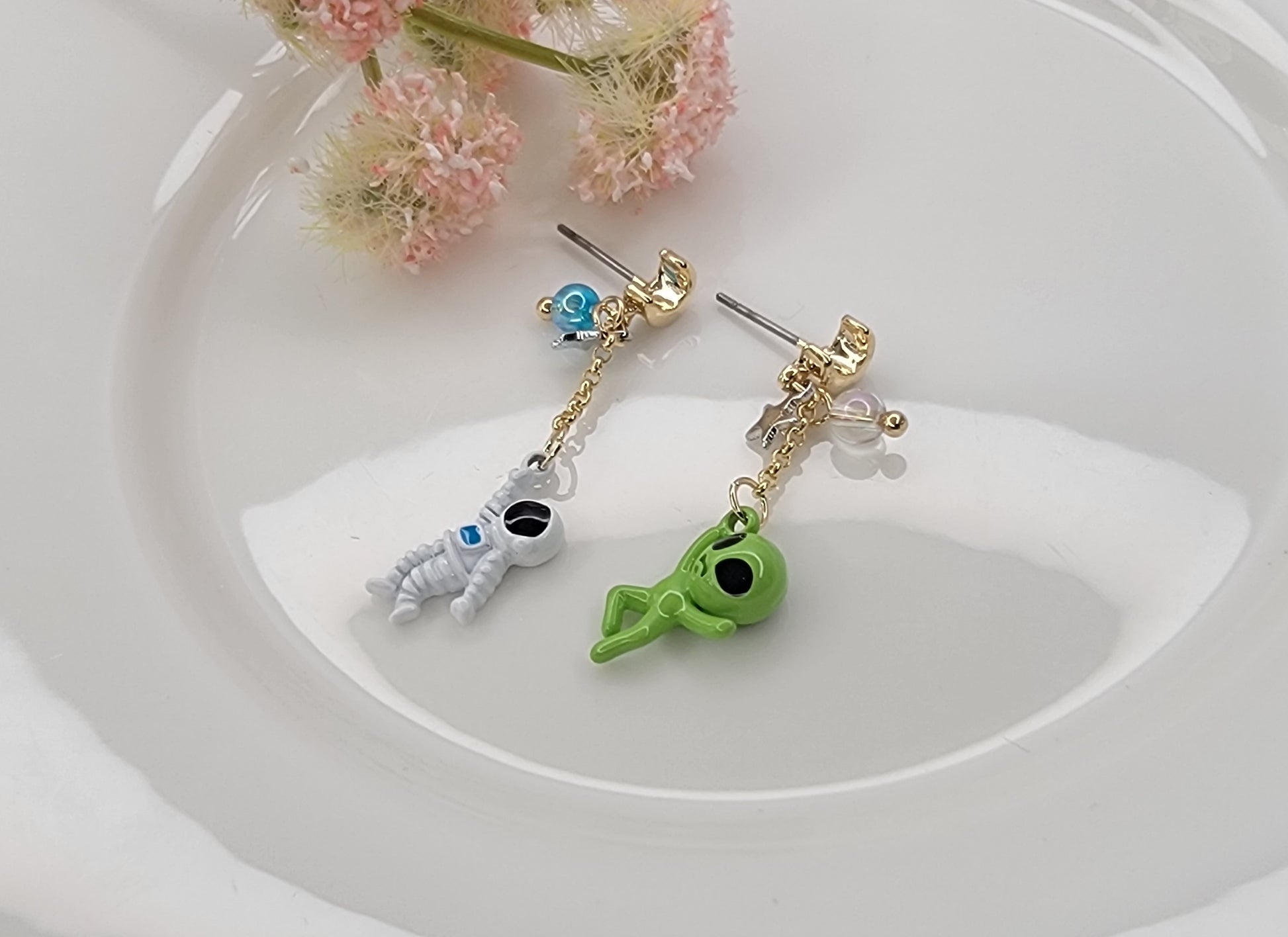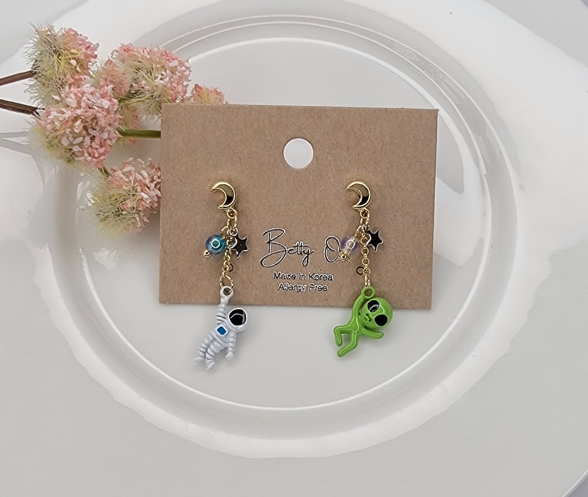 - ASTRONAUT AND ALIEN UNBALANCE DANGLE EARRINGS.