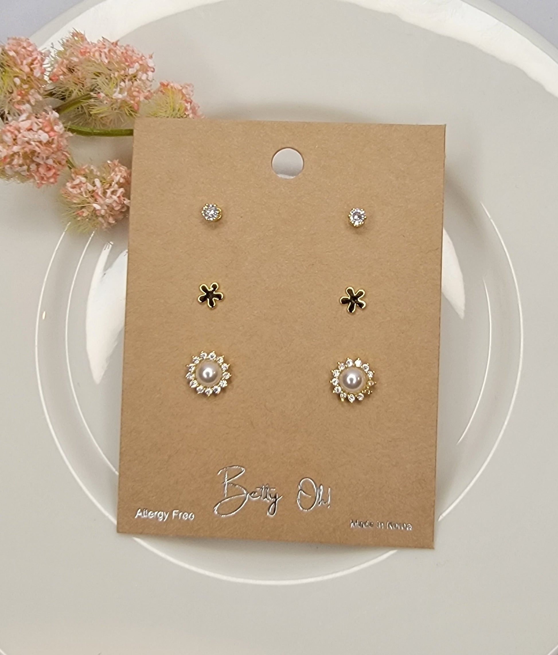 - PEARL FLOWER MINI THREE PAIR SET POST EARRINGS.